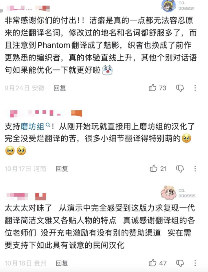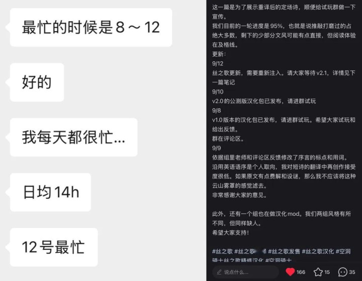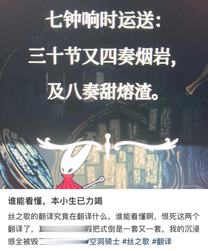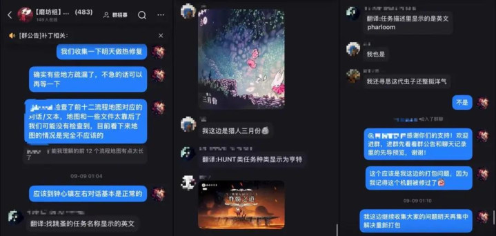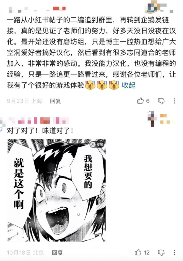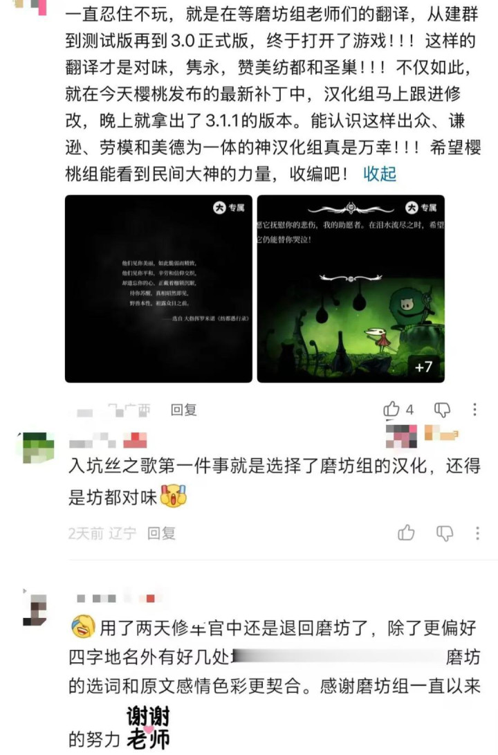 修车组和磨坊组,算是两个最早决定给《空泛骑士:丝之歌》作念民间汉化的团队。两个汉化组之前并莫得太多交流,却迅速建立起一种战友般的默契。游离态分享了他的决策,磨坊组的乱码随即消散。