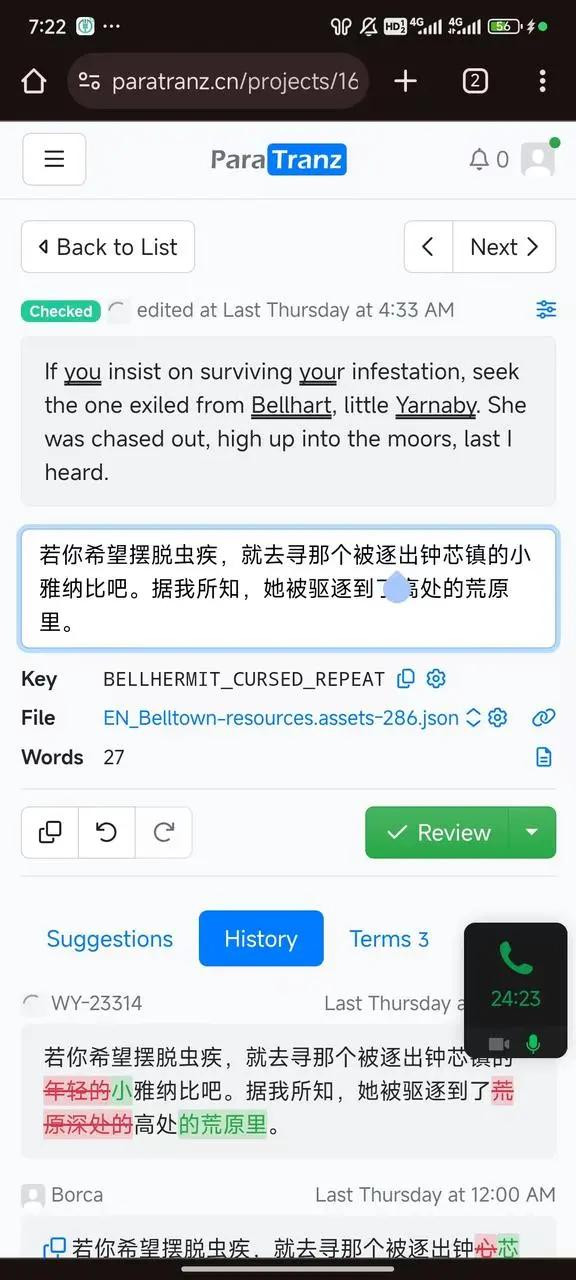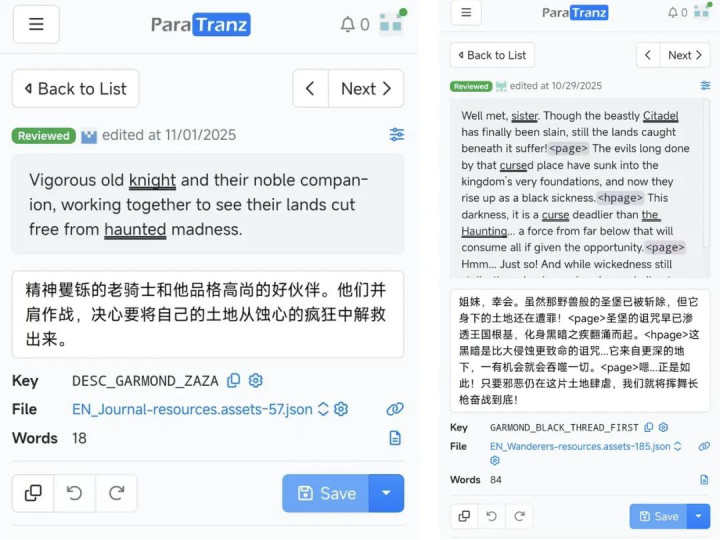 为了让寰球对翻译进程把合手得更明晰,团队还决定谨慎使用Paratranz(游戏汉化合作平台)。这个名字一发出来,枣憨厚坐窝认了出来:「这个我翻《司辰之书》的时候用过!」