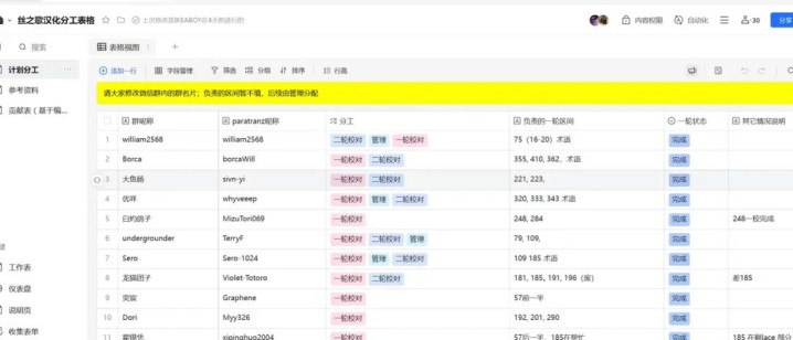 对此,地铁东说念主、枣憨厚和鱼憨厚决定制作细心的单干表格。他们依据术语、扮装等轨范,将几千条规本拆成了一个个散装任务,由群内成员主动来认领。